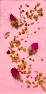 Склад: какао-масло, молоко сухе незбиране, цукор, молоко сухе знежирене, суха молочна сироватка, соєвий лецитин, ароматизатор ванілін, бутони чайної троянди, фісташка, мигдаль, насіння соняшника, харчовий барвник.