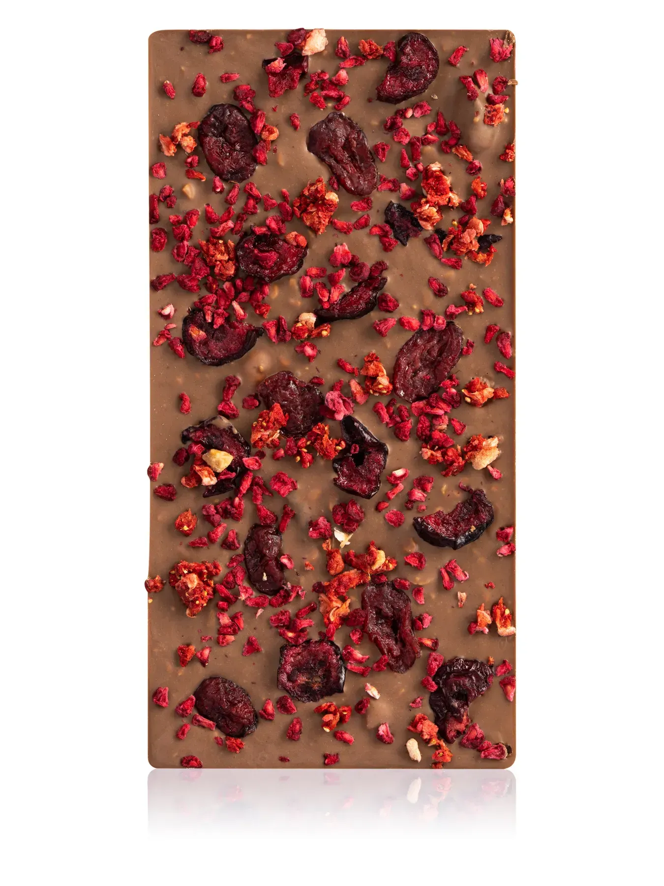 Чудова нагода подарувати собі трішки солодкої радості навіть без особливого приводу! Молочний шоколад із горіхами завжди на вершині наших уподобань. А додати до нього трохи кислих ягід – чому б і ні? Ідеальне поєднання смаків для справжніх гурманів.