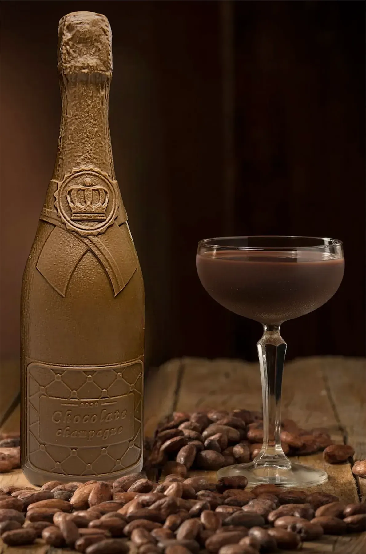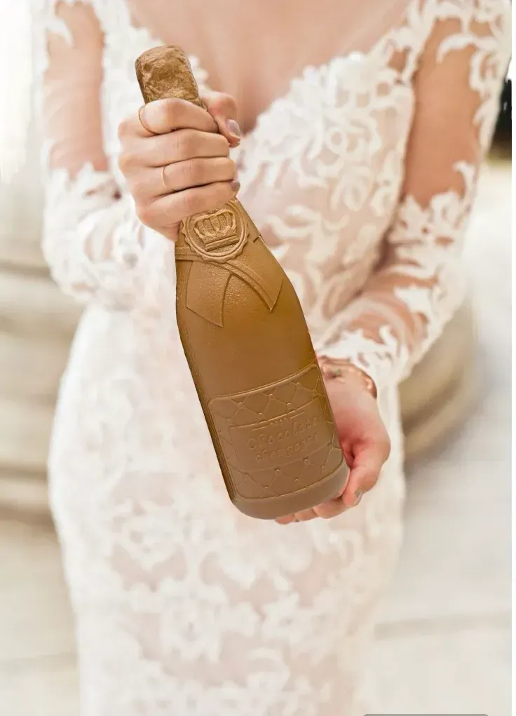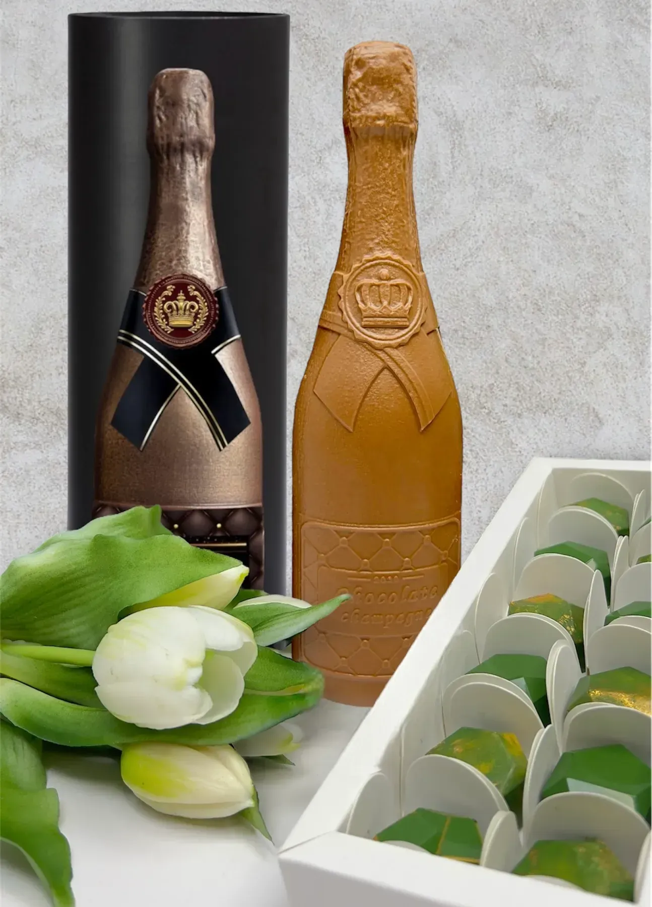 Пляшка шоколаду у вигляді шампанського з деталізованими елементами виконана з молочного шоколаду з додаванням горіхів і подається в елегантному чорному подарунковому тубусі. Це стильний та смачний подарунок до будь-якого свята чи події, який підходить і чоловікам, і жінкам, незалежно від професії.