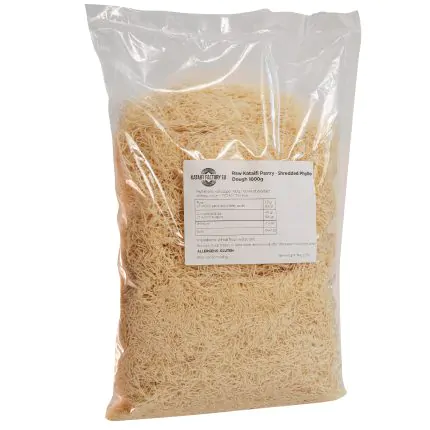 Катаїфі у сирому вигляді — виготовлений із тонких ниток тіста, ретельно сформований і залишений несмаженим, щоб максимально зберегти свіжість і пластичність. Має м’яку, ніжну текстуру, яку легко обробляти: тісто зручно формувати, наповнювати начинками чи використовувати шарами. Завдяки високоякісним інгредієнтам воно чудово підходить як для класичних десертів на кшталт баклави, так і для сучасних варіацій з кремом, фруктами чи шоколадом. Саме сире катаїфі також є важливою складовою популярного десерту “Дубайський шоколад” — розкішної багатошарової солодощі, що набирає популярності в Європі та на Близькому Сході.