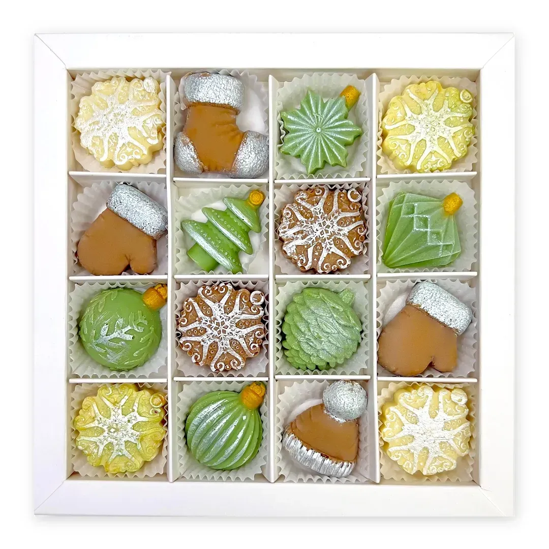 Оригінальні, святкові та вишукані — шоколадні іграшки із позолотою поєднують білий шоколад із кокосом та цукатами, створюючи неймовірно смачний та красивий подарунок.