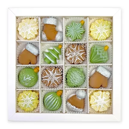 Авторські святкові цукерки у різдвяній коробці — ідеальний солодкий сувенір для справжніх поціновувачів шоколадної краси. Кожна цукерка ручної роботи створена для того, щоб дарувати насолоду у кожному шматочку та залишати в пам’яті лише приємні моменти свята.